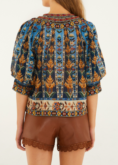 FARM Rio Embroidered Tapestry Blue Short Sleeve Blouse