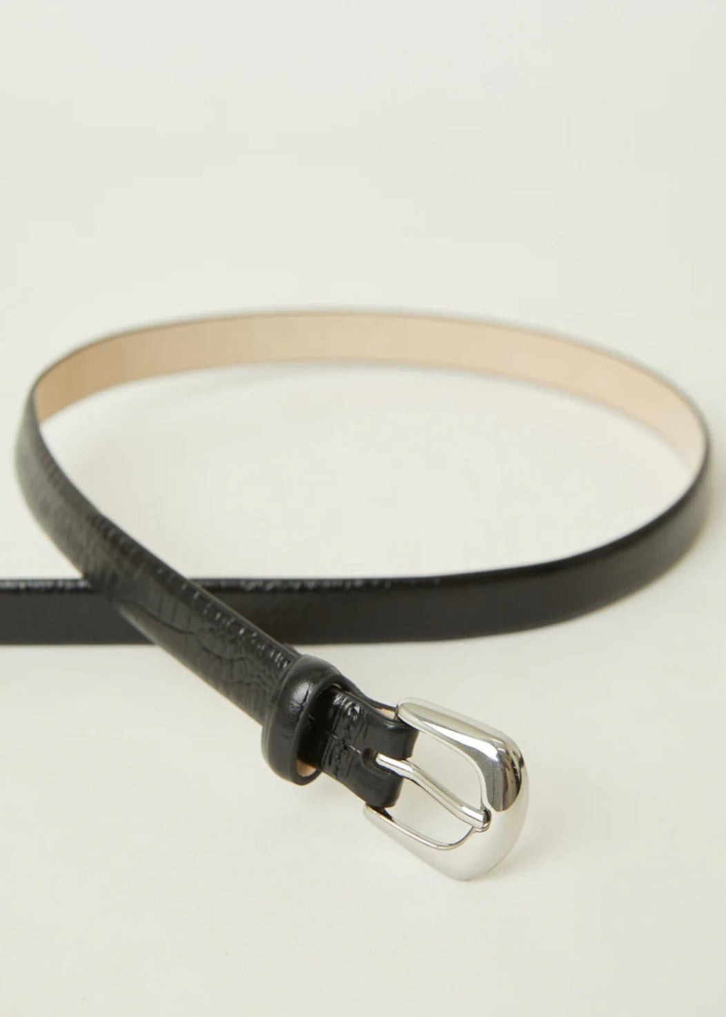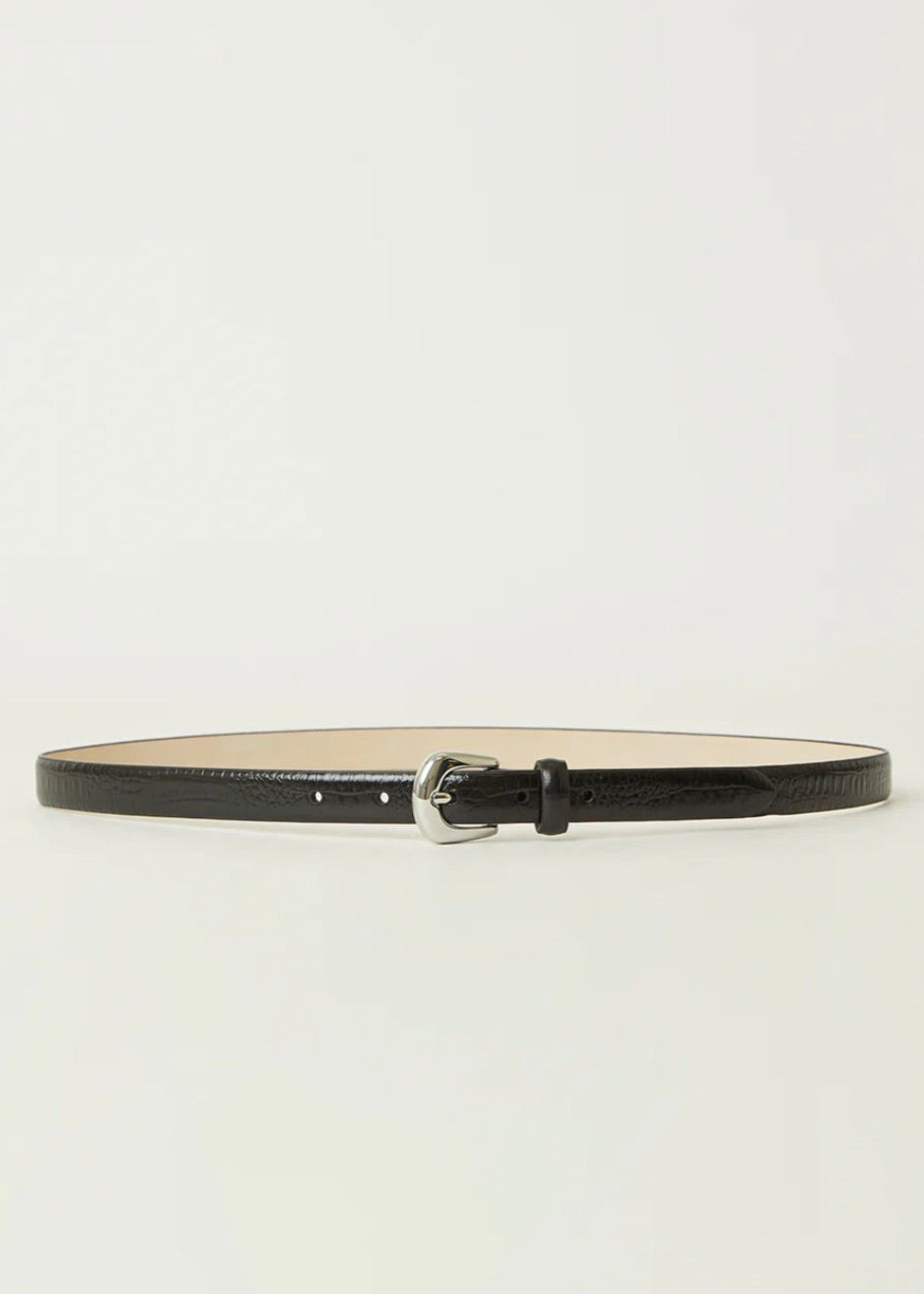 Our signature Kennedy Mini belt reimagined. This classic style is designed with our best-selling Kennedy Mini buckle on a thin, faux croco-embossed leather strap. Detailed with a feathered edge and leather keeper.