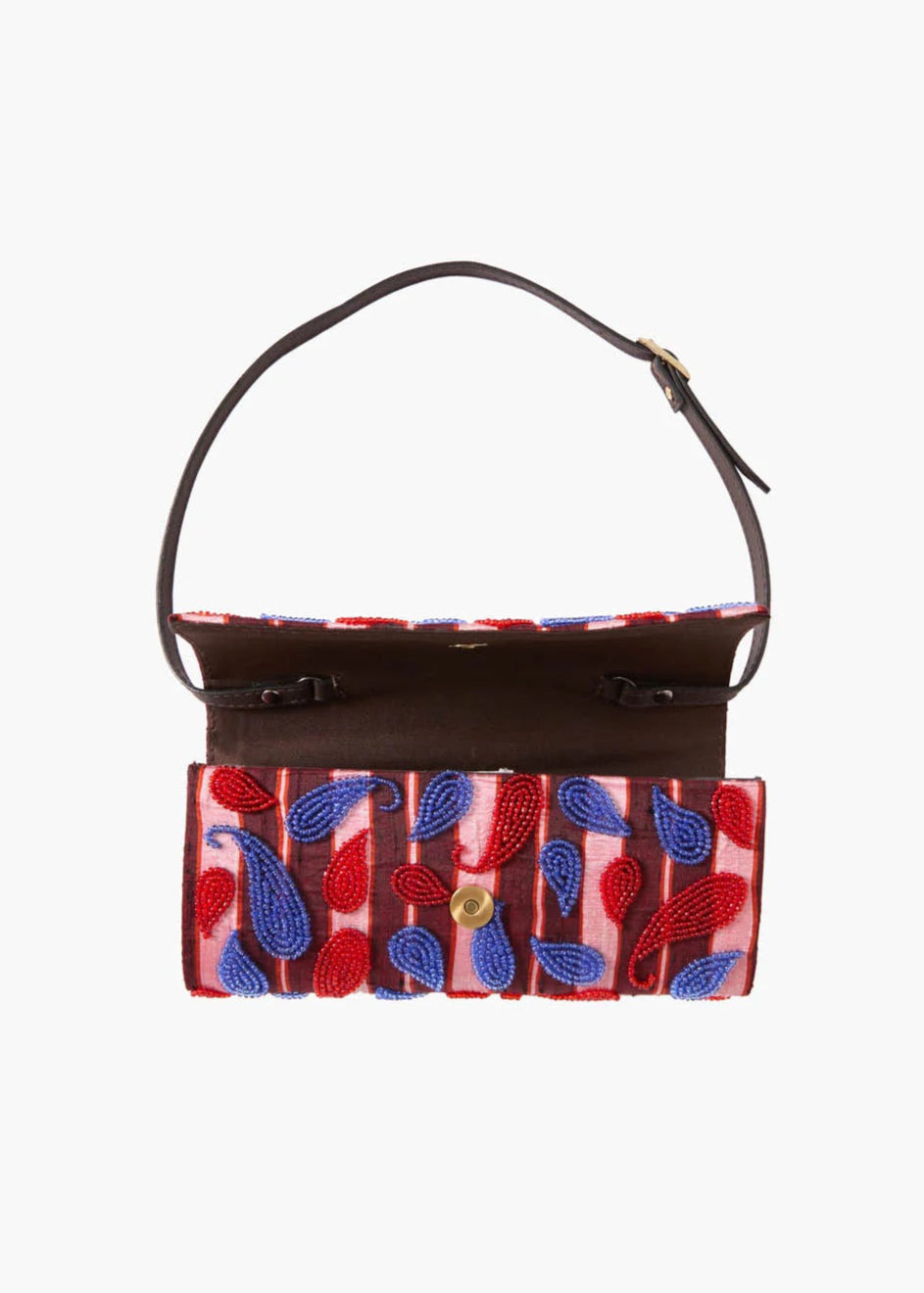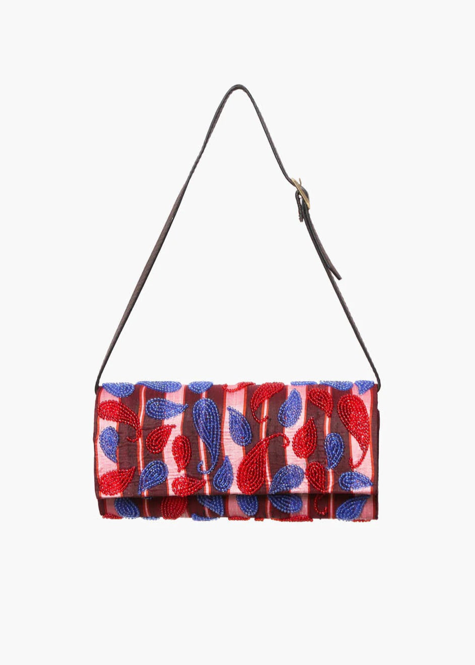 Designed to be carried with or without the included leather strap, this adaptable charmer is the perfect size—with just enough room to hold your essentials. A beaded paisley pattern is embroidered on the silk face of this shoulder bag, creating a playful interplay of light and texture.