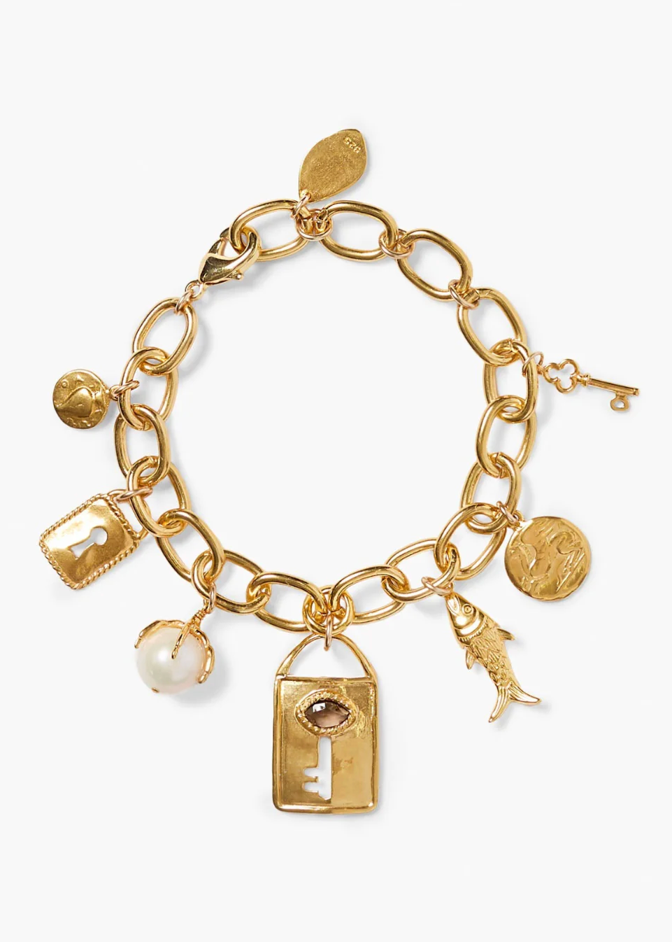 Chunky gold charm bracelet featuring smoky quartz, freshwater pearl, a Pegasus coin, articulated fish, and locket and key charms forming a museum of treasures.