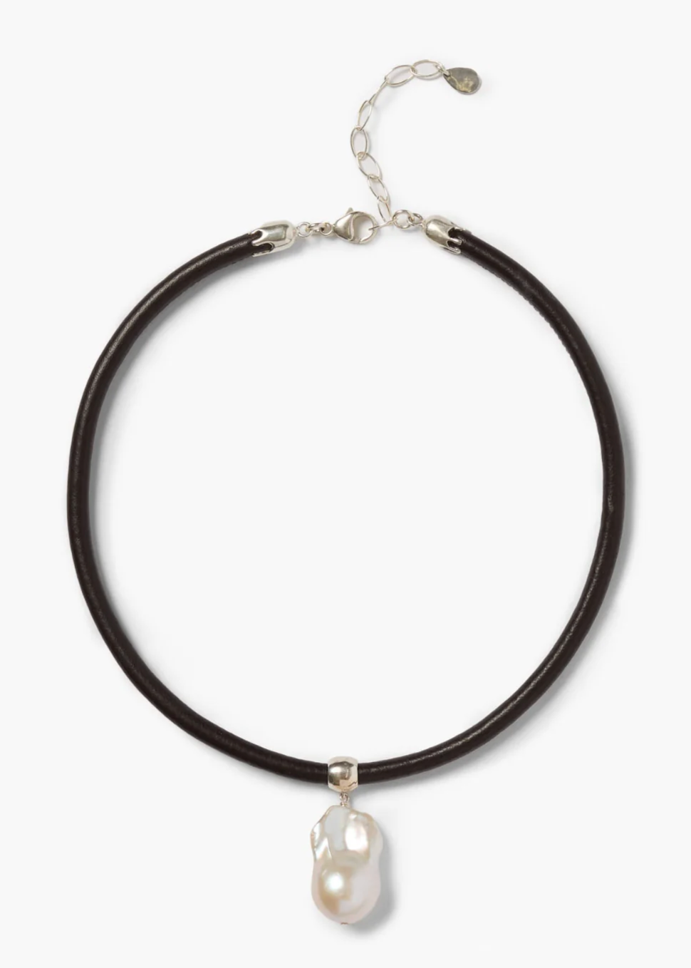 - Sterling silver, white baroque pearl, stitched leather cording.