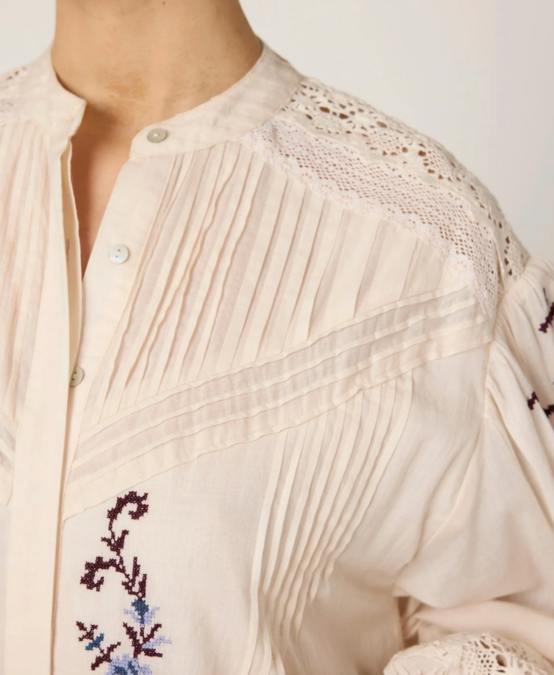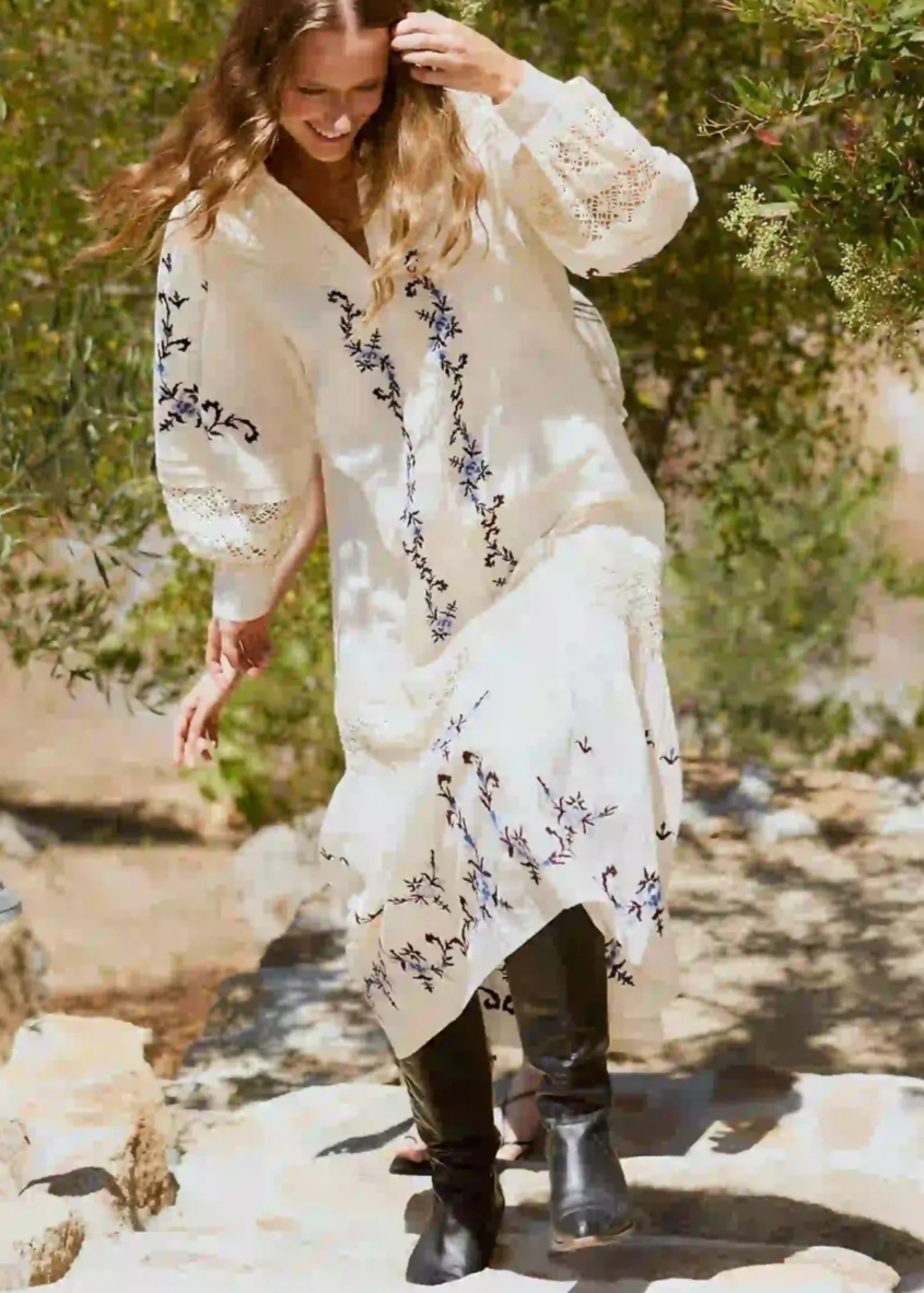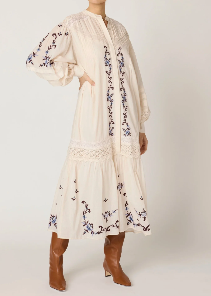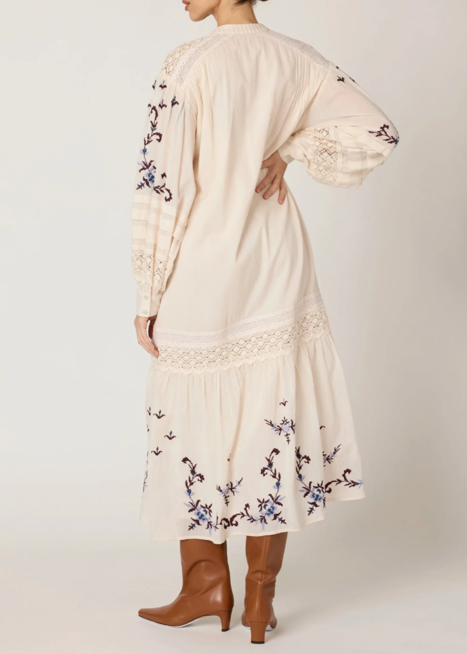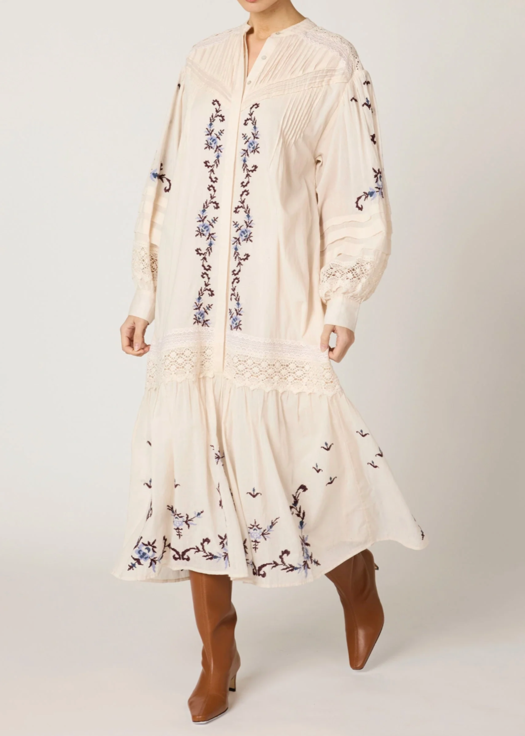 The Heidi Midi Dress is made from 100% GOTS certified organic cotton, offering a timeless silhouette with thoughtful detail. This long-sleeve, high-neck midi dress features delicate chainstitch embroidery, pintuck accents, and inserted lace detailing—perfect for elevated everyday wear or special occasions with a touch of vintage charm.
