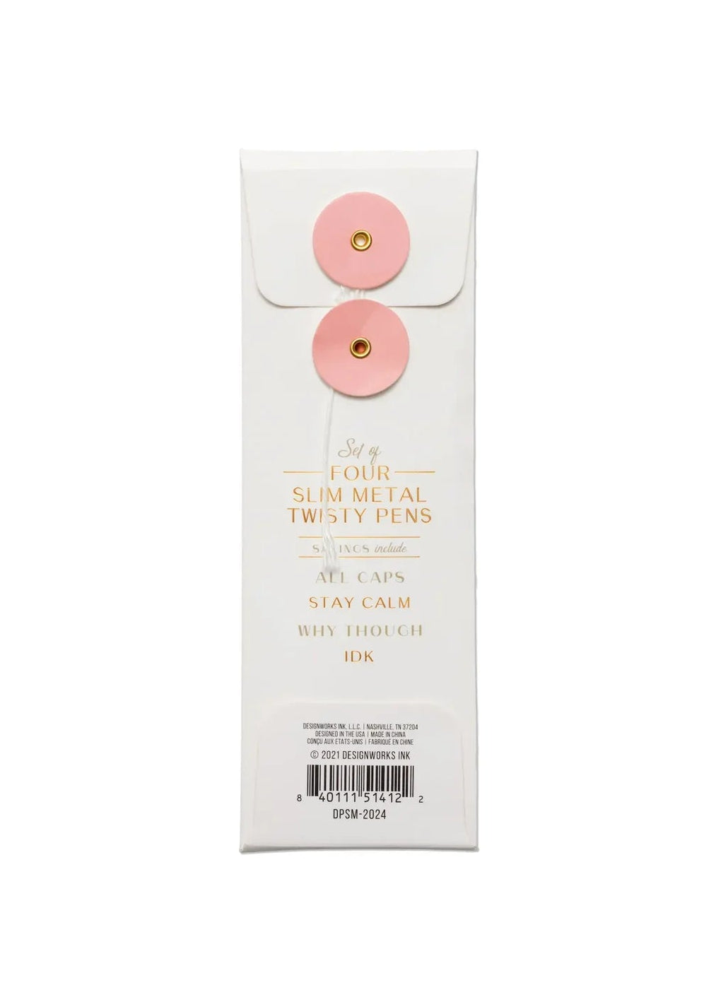 Find a little boost from sassy affirmations as your write using the DesignWorks Ink Slim Metal Twisty Pens - Sass Set. As you take notes, write to-do lists, and journal, you will find that these smooth-flowing colorful pens help you write through the day with ease. Set of four inspirational quote pens include: "All Caps", "Stay Calm", "Why Though", and "IDK".
