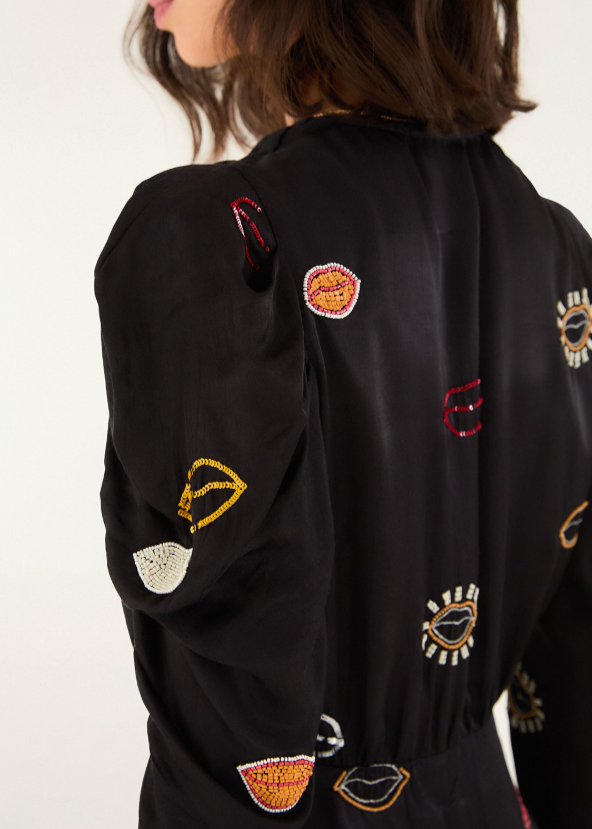 Cocktail hour toasts feel decadent in this playful vintage-inspired wrap dress cut from lightweight satin and finished with beaded lips.