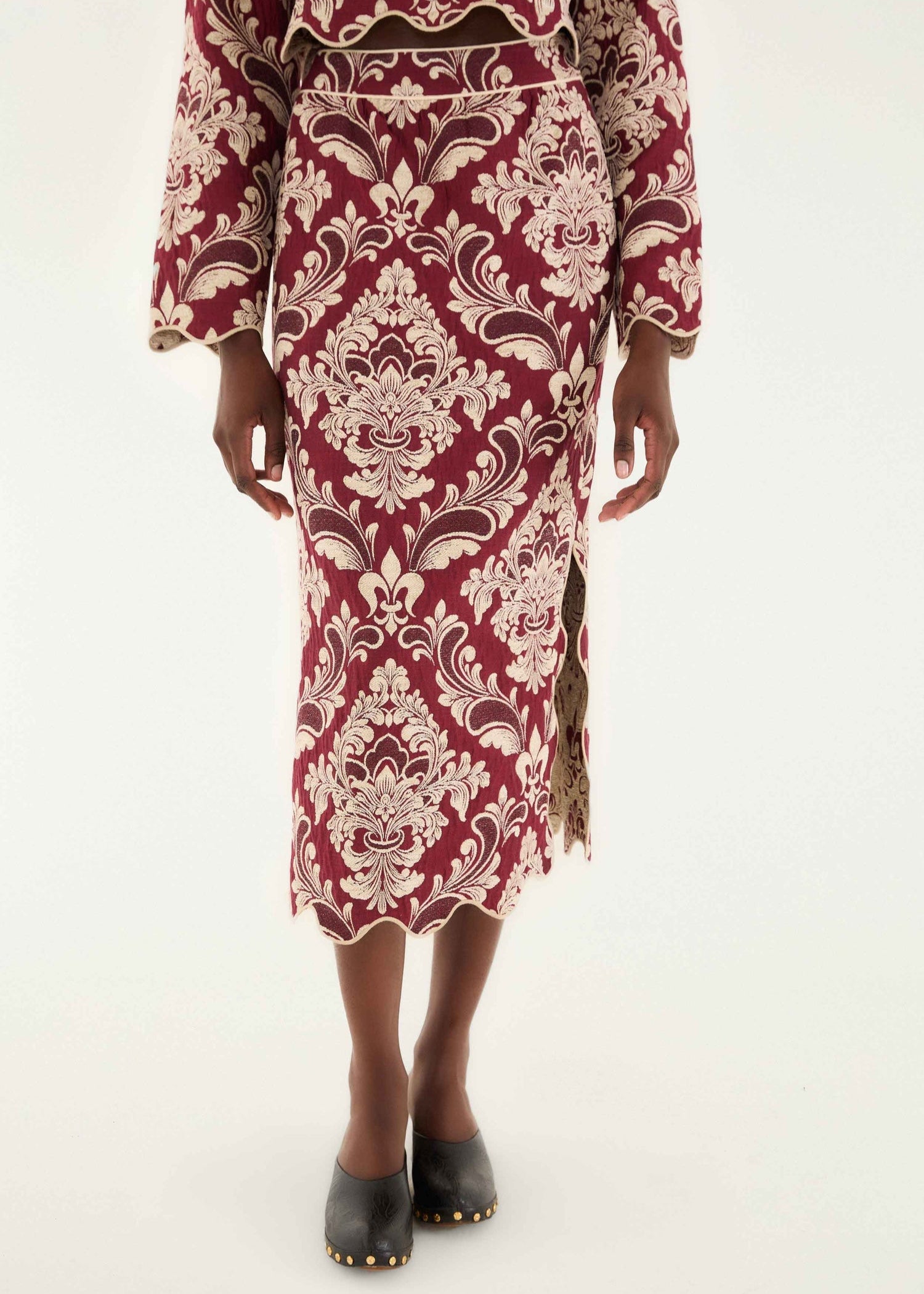 Embrace elegant charm with the Bicolor Jacquard Waves Midi Skirt by FARM Rio, featuring a rich burgundy canvas adorned with intricate ivory baroque motifs. The structured jacquard fabric caresses a flattering midi silhouette, while its scalloped hem and side slit add a playful yet refined touch. This piece marries classic sophistication with a warm, inviting texture, perfect for those who cherish wearable artistry and understated grace.