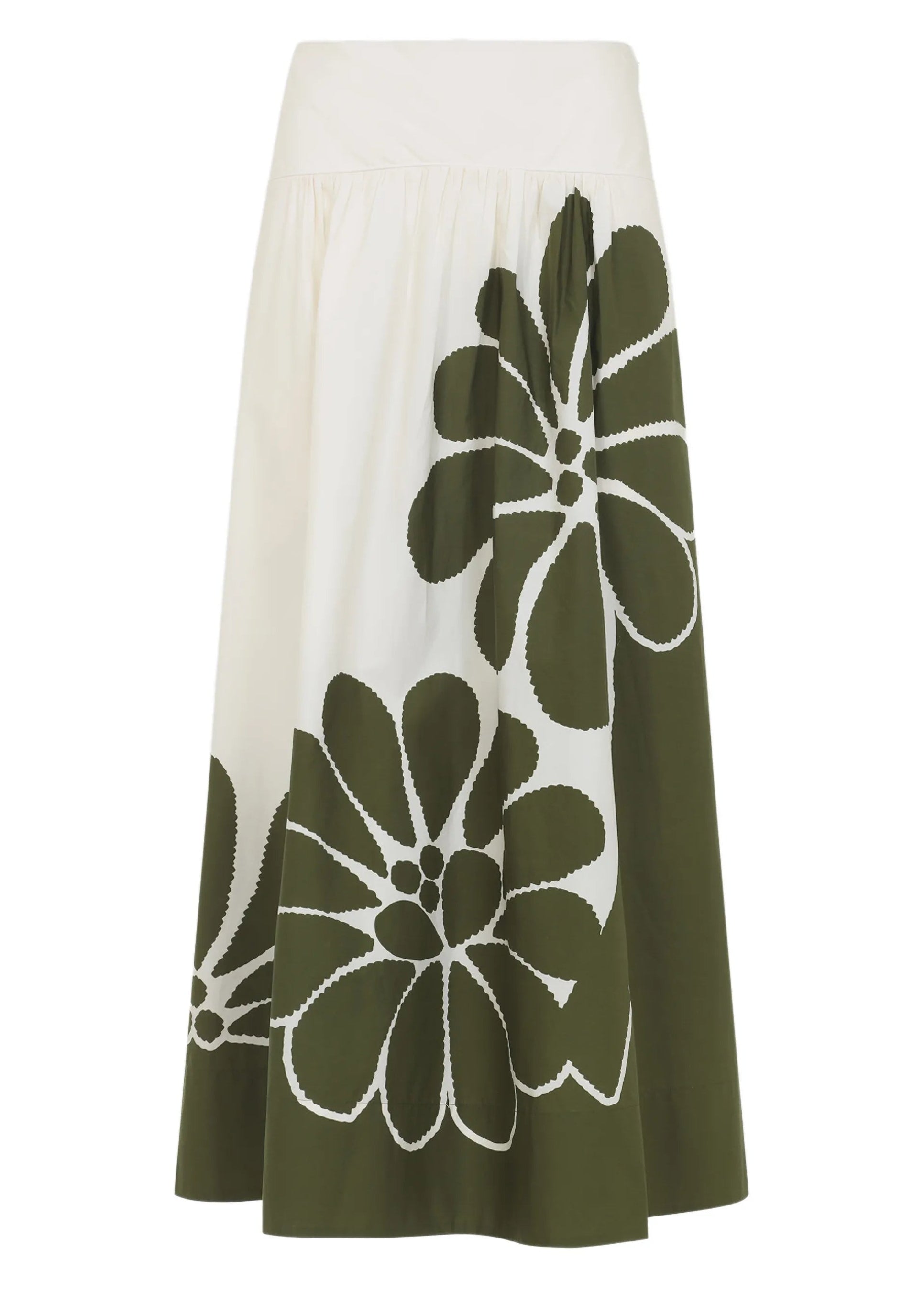 Flared midi skirt crafted from white cotton with a green floral print, it features a bold waistband smocked at the back and a concealed zip fastening at the side.