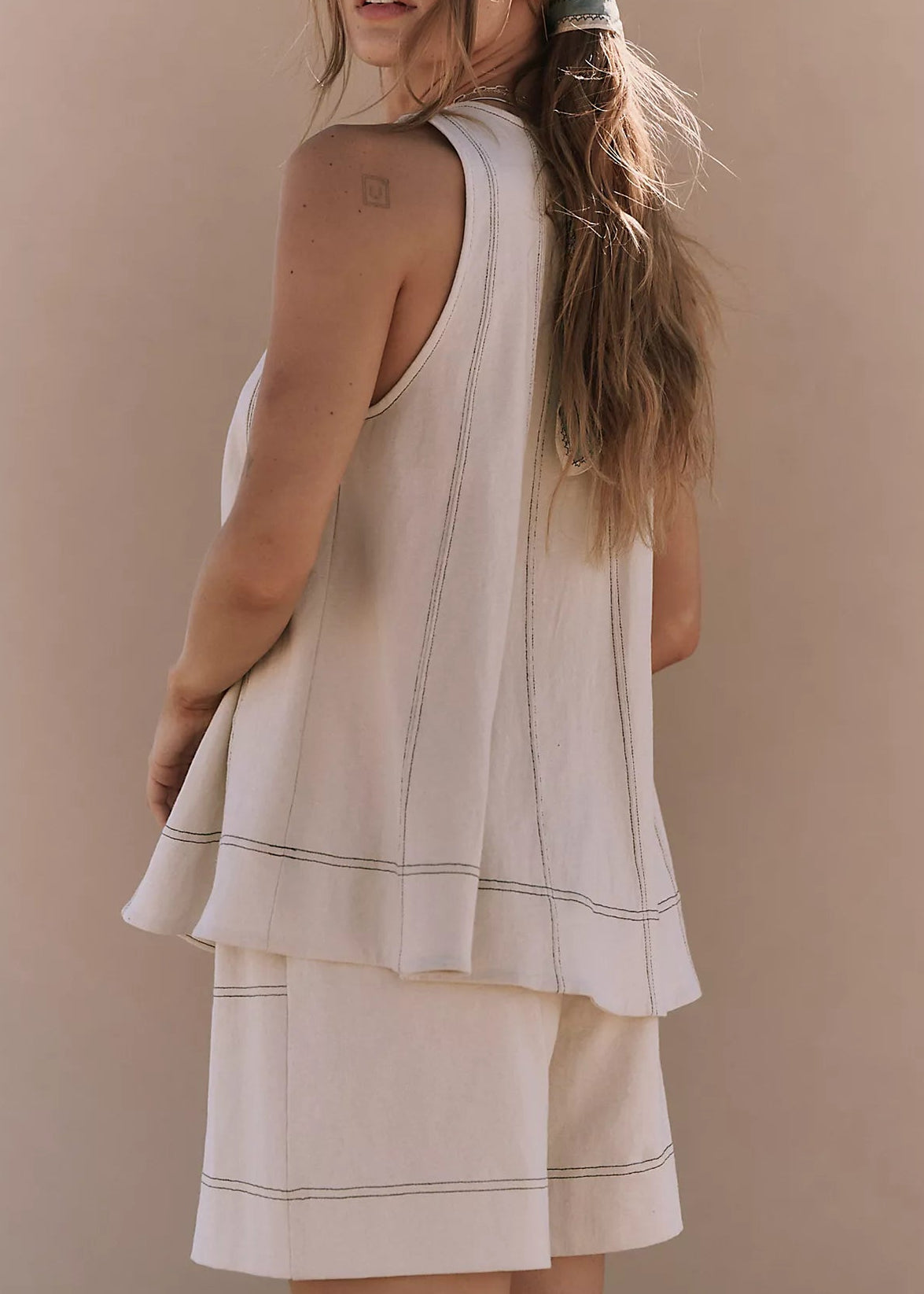 Features: Top: High neckline, dropped armholes, contrast popstitch seaming; Shorts: Pull-on design, side pockets, coordinating stitching