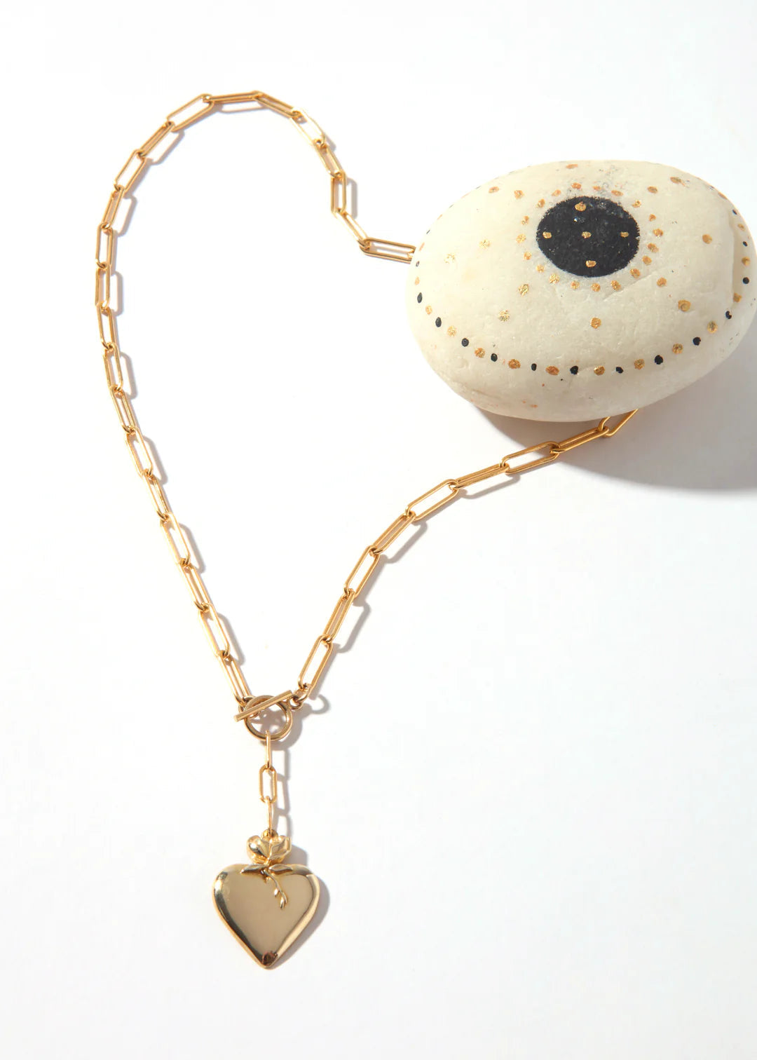 Brass blooming heart pendant on gold filled paperclip chain with toggle closure.