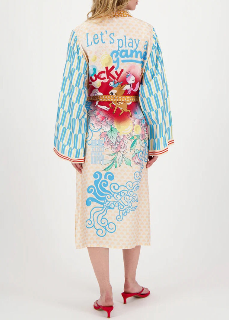 Belted kimono dress in our Lucky Me pattern. Long sleeves and lapels. Every part of the dress is a different pattern. Dress reads “Let’s play games” across the top of the back. Wear this dress and add some retro glamour to your wardrobe.