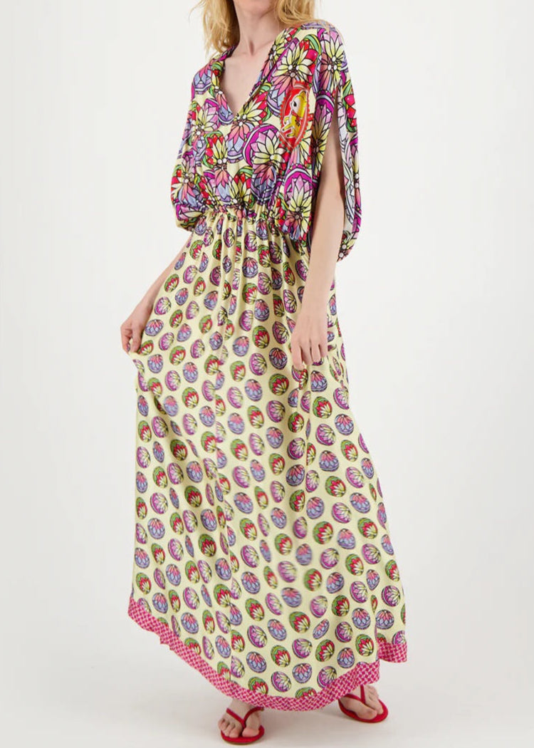 Kaftan dress in our Lucky Me print. Elastic waist gives the bodice a pretty, blousy look. Sleeves are puffed, elbow length and slit to the shoulder.