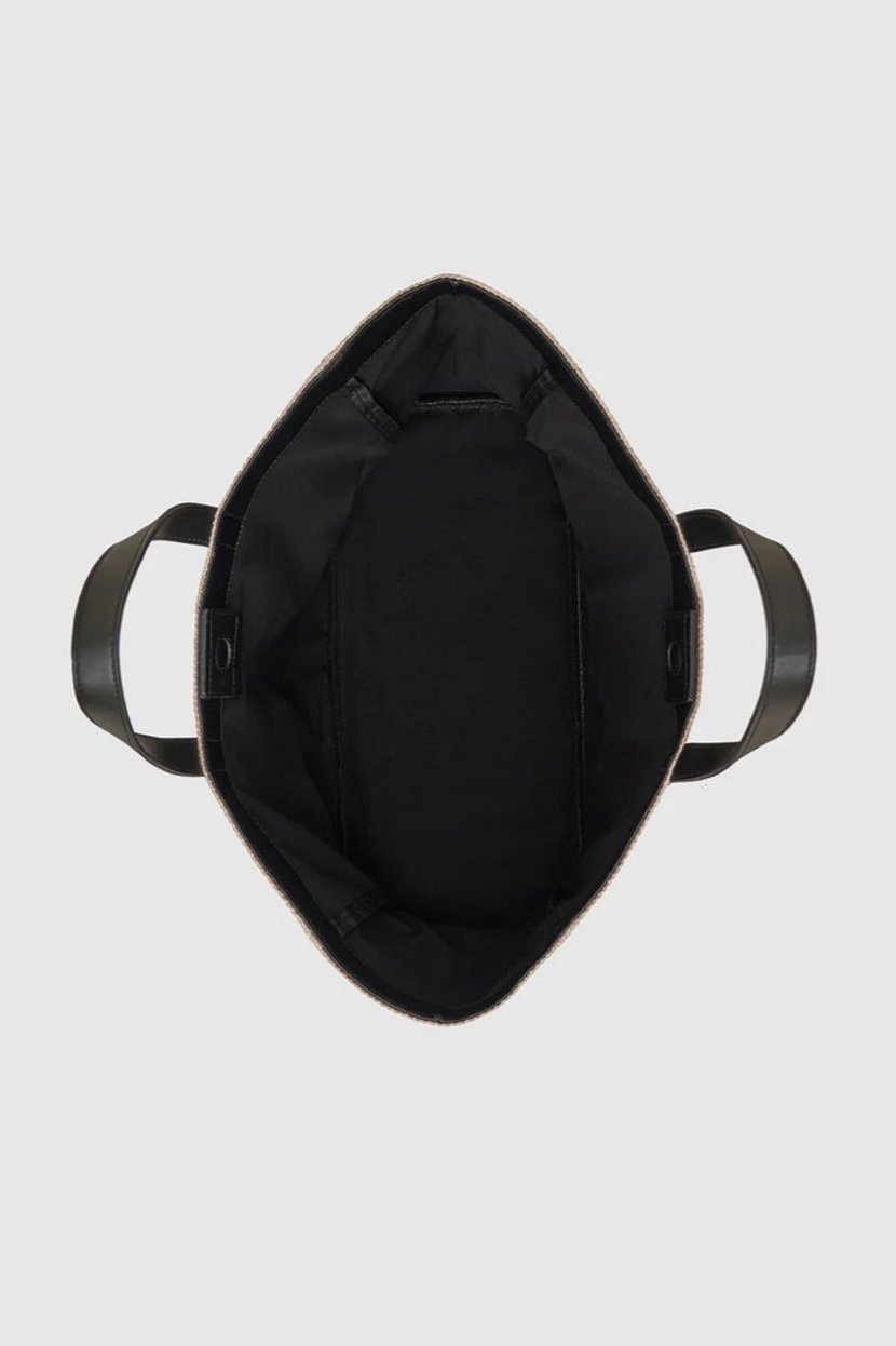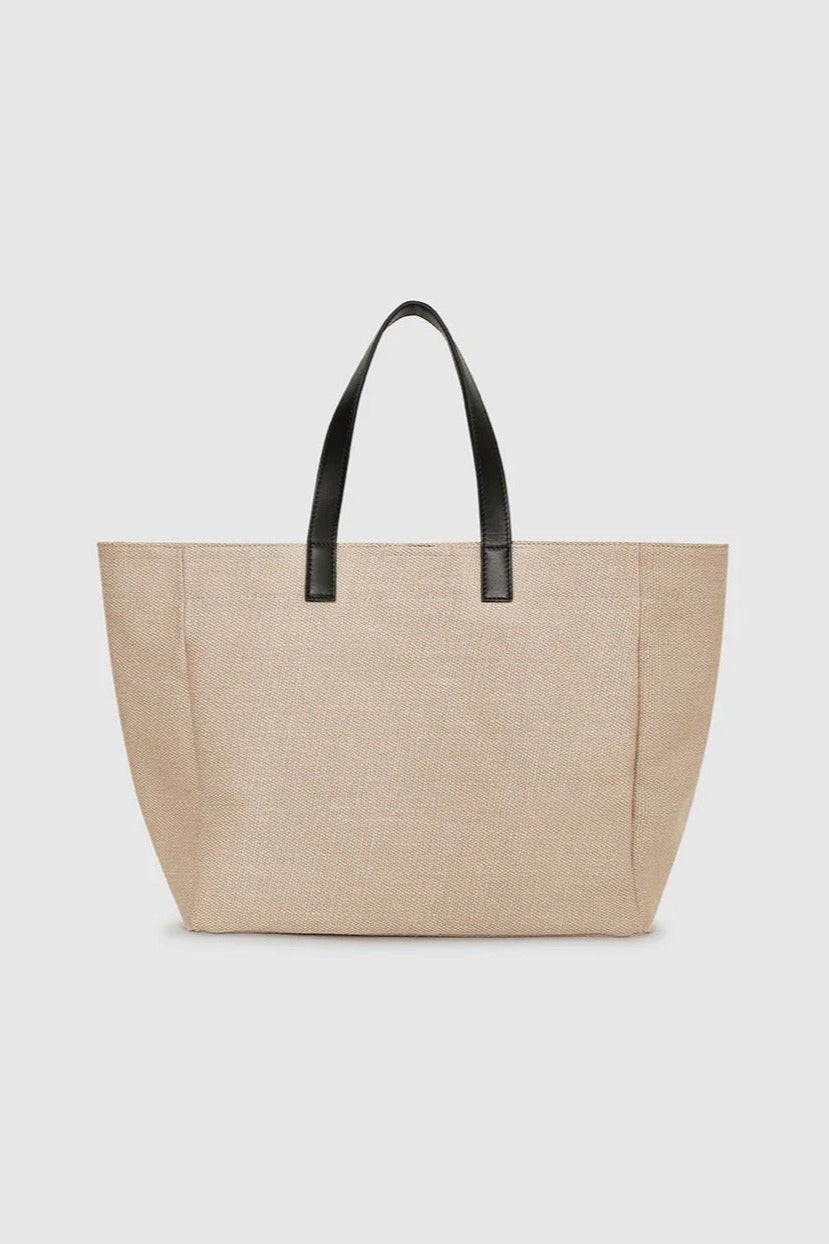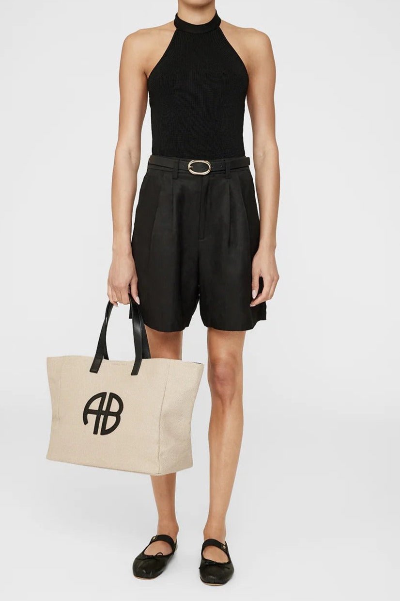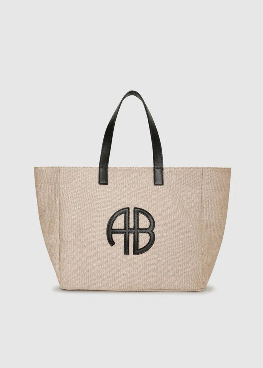The Medium Rio Tote is a vacation essential made from 100% linen fully lined in a soft cotton fabrication. This style features a magnetic snap closure, two black leather straps for easy transport, and a coordinating ANINE BING monogram at the center front.