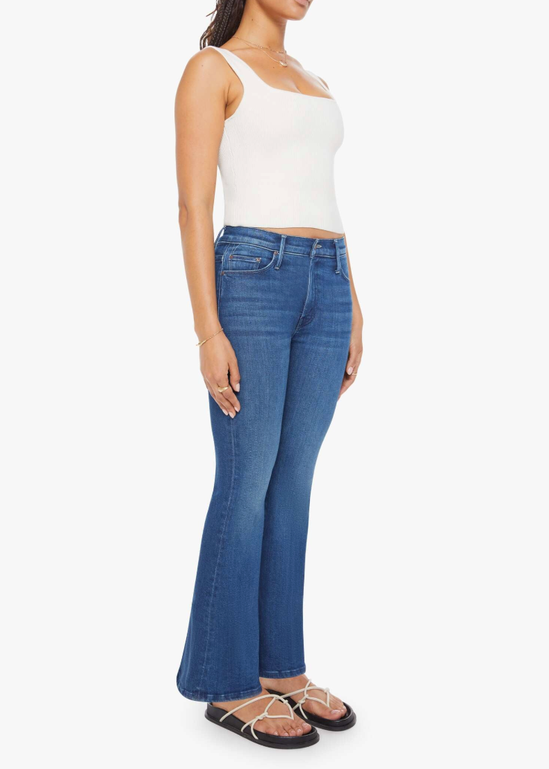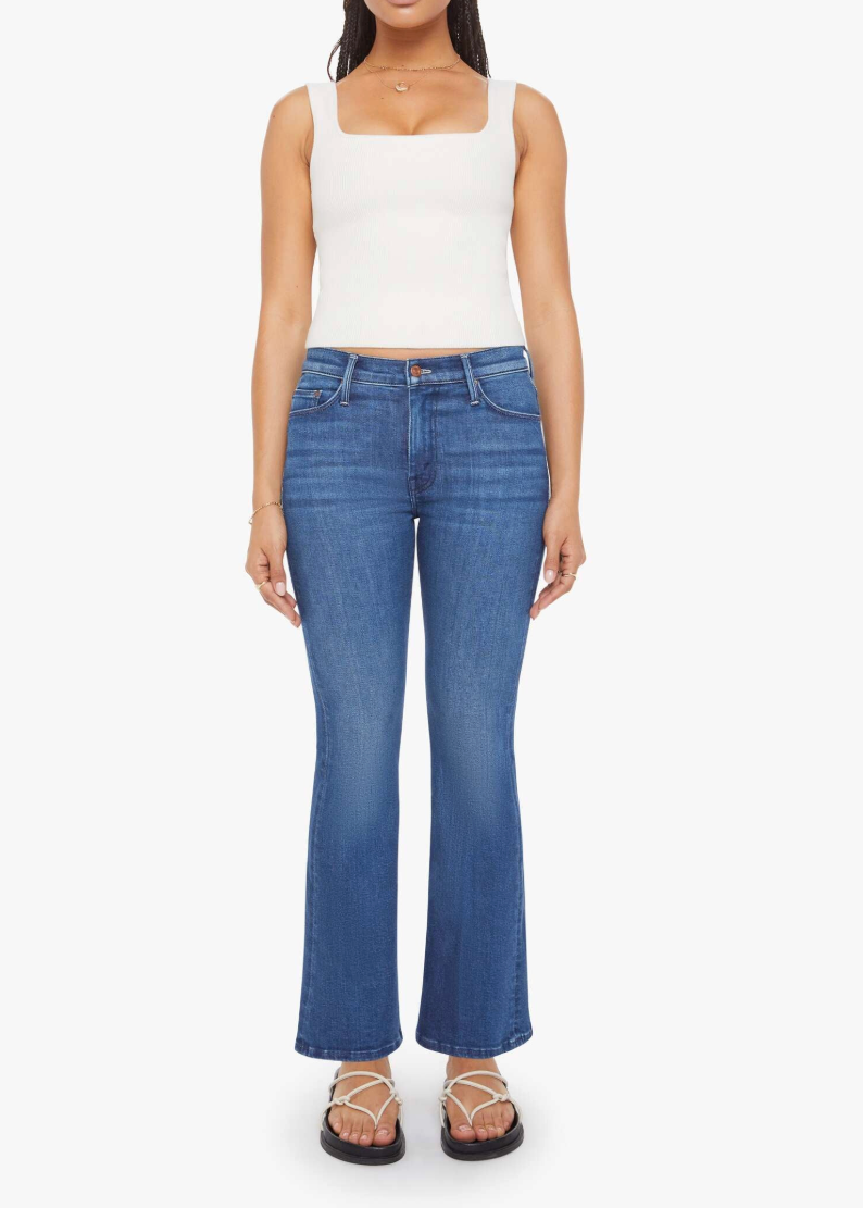 This cult-favorite flare jean has a mid rise, zip fly, sneaker-length inseam and a clean hem. Made from stretch denim, Nip It In The Butt is a mid-blue with whiskering and fading at the knees.