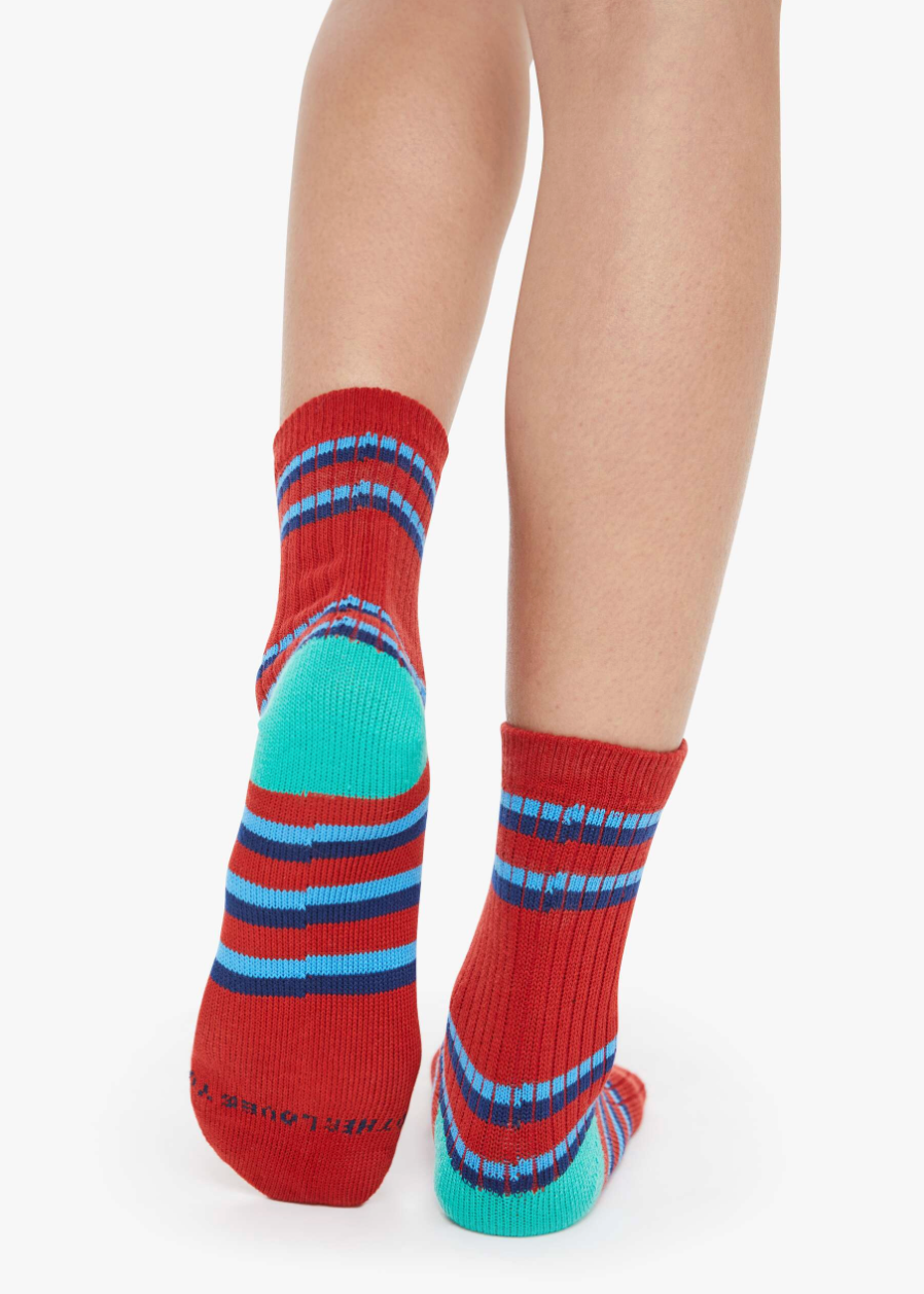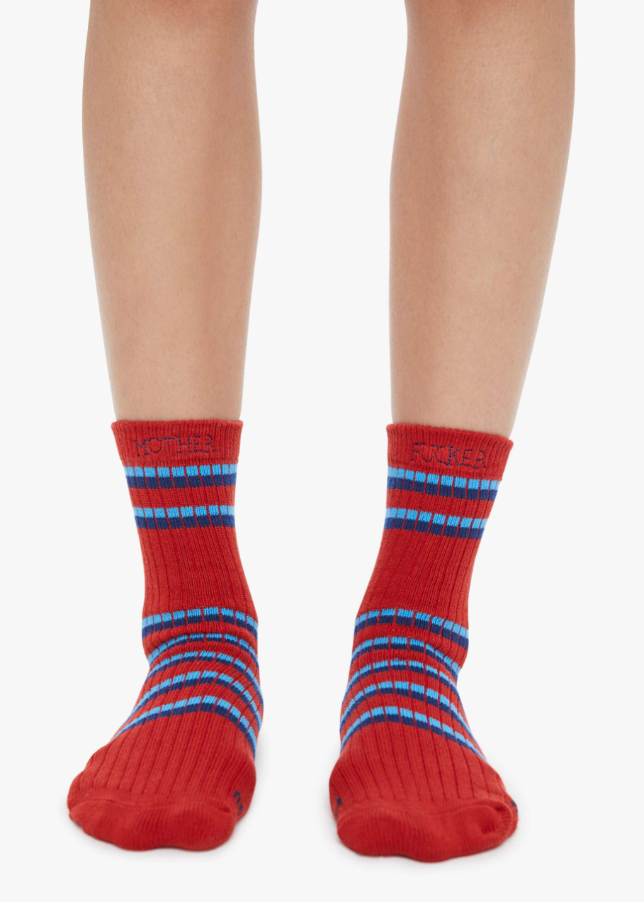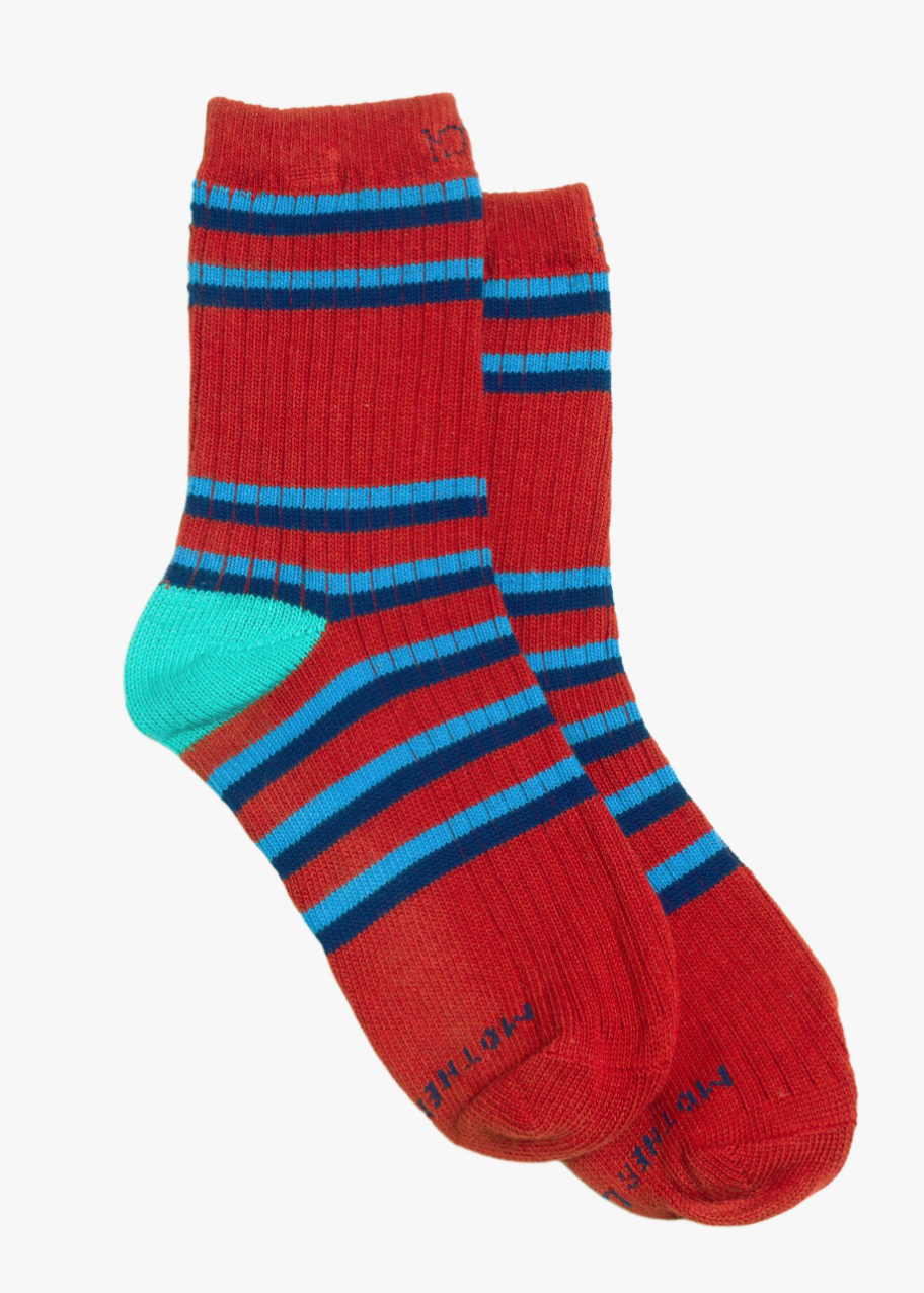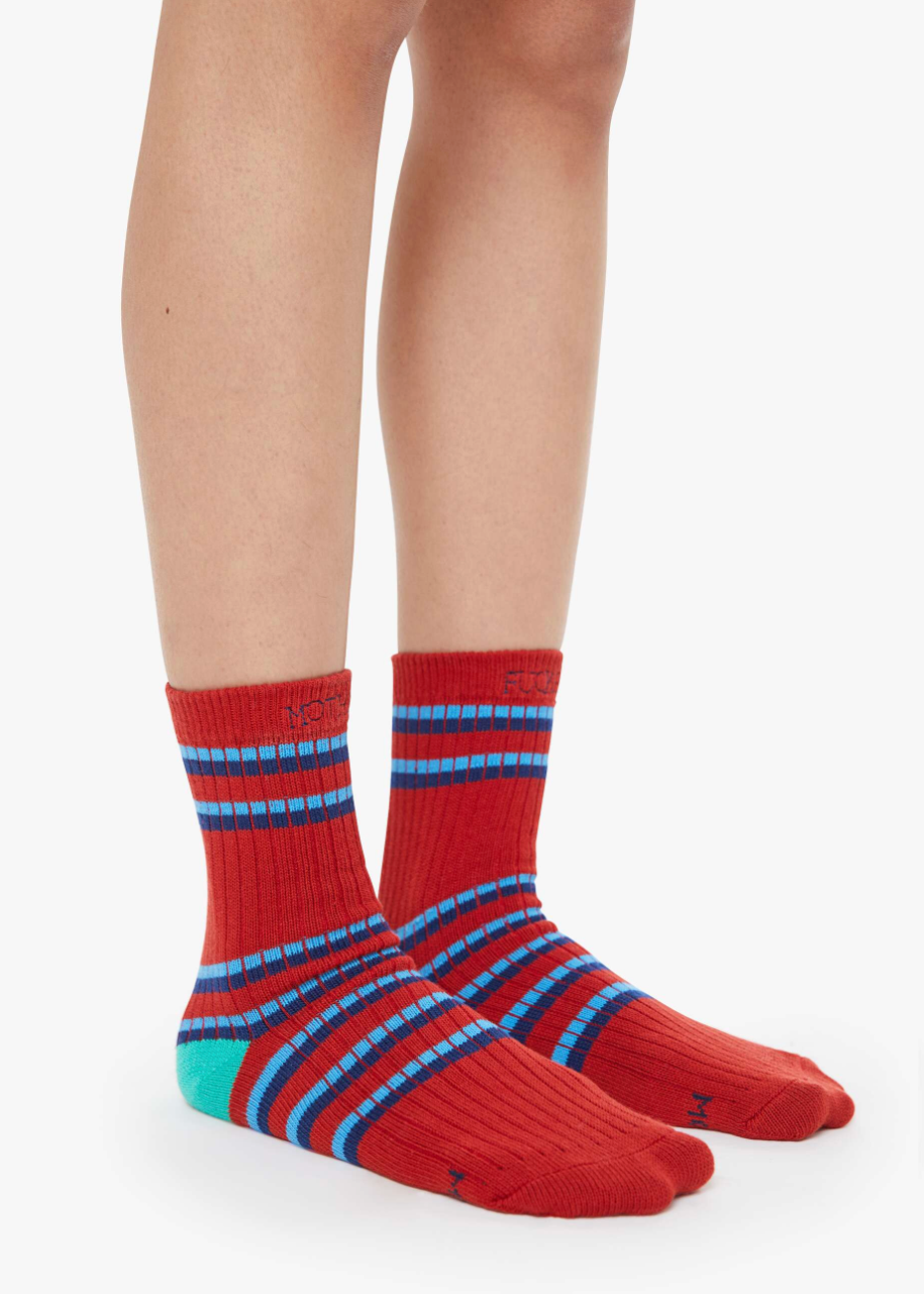 Two of a kind. Tube socks with a message from MOTHER. Shown here in red with blue stripes and text across the top.