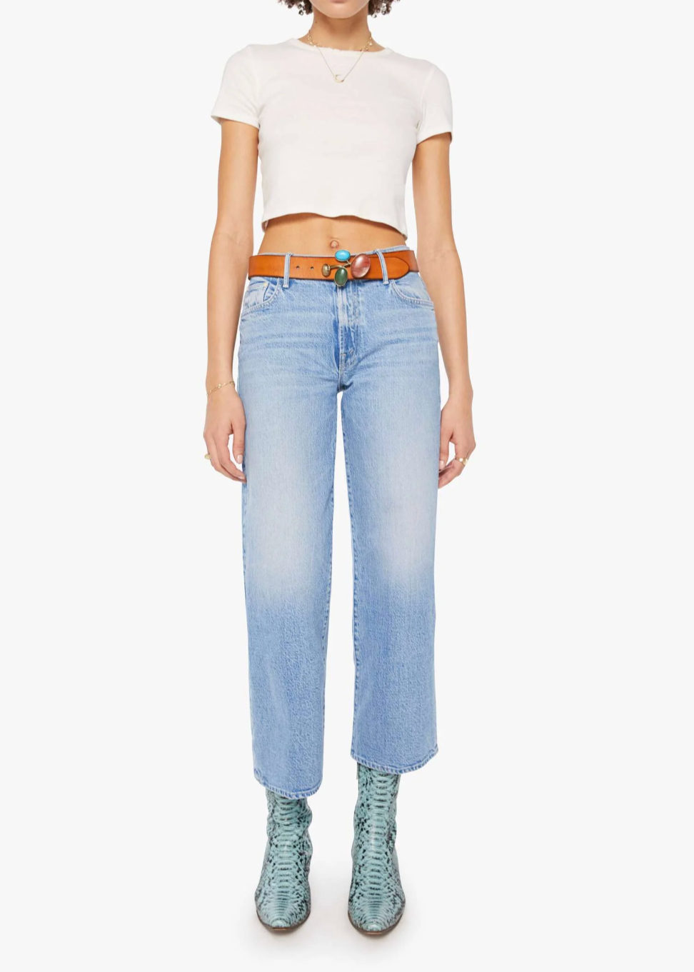 Buckle up. A wide, vintage-inspired leather belt with a chunky metal buckle detailed with turquoise, amber, green and pale yellow stones. The Jewelry Box is made from 100% cow leather in brown with subtle distressed details.