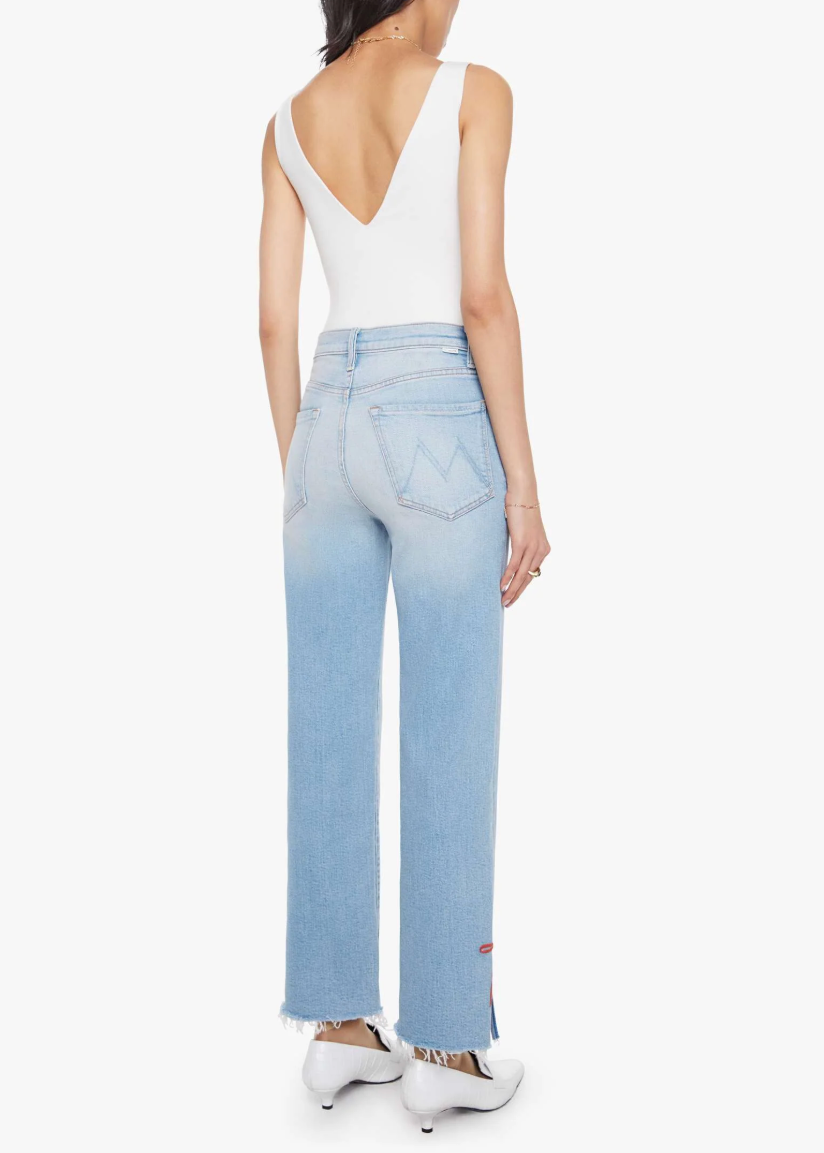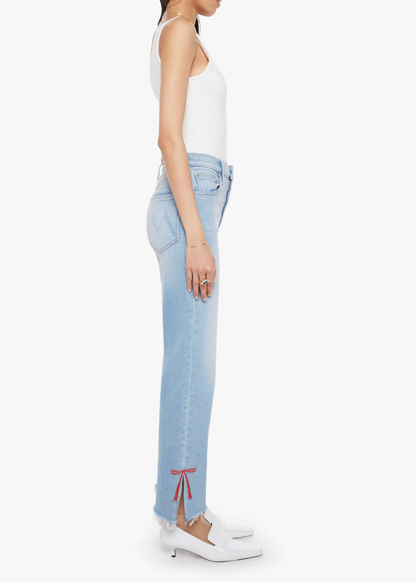 Full circle moment. High-waisted jeans with a straight leg, zip fly and a cropped 29-inch inseam with a sliced outer seam and a frayed hem. Cut from a blend of recycled stretch denim, Complete 360 is a light blue with whiskering, fading and red bows embroidered at the ankle.