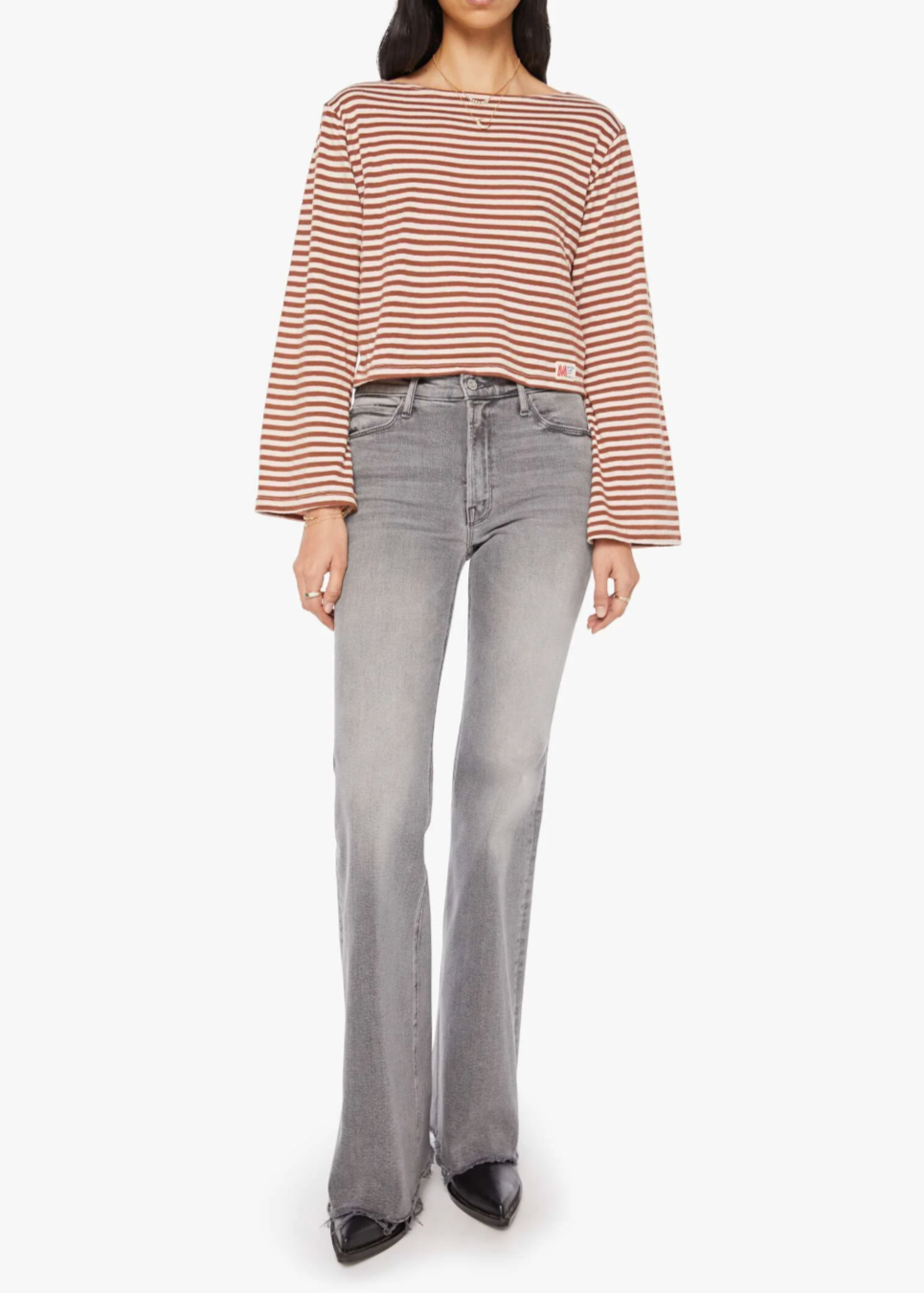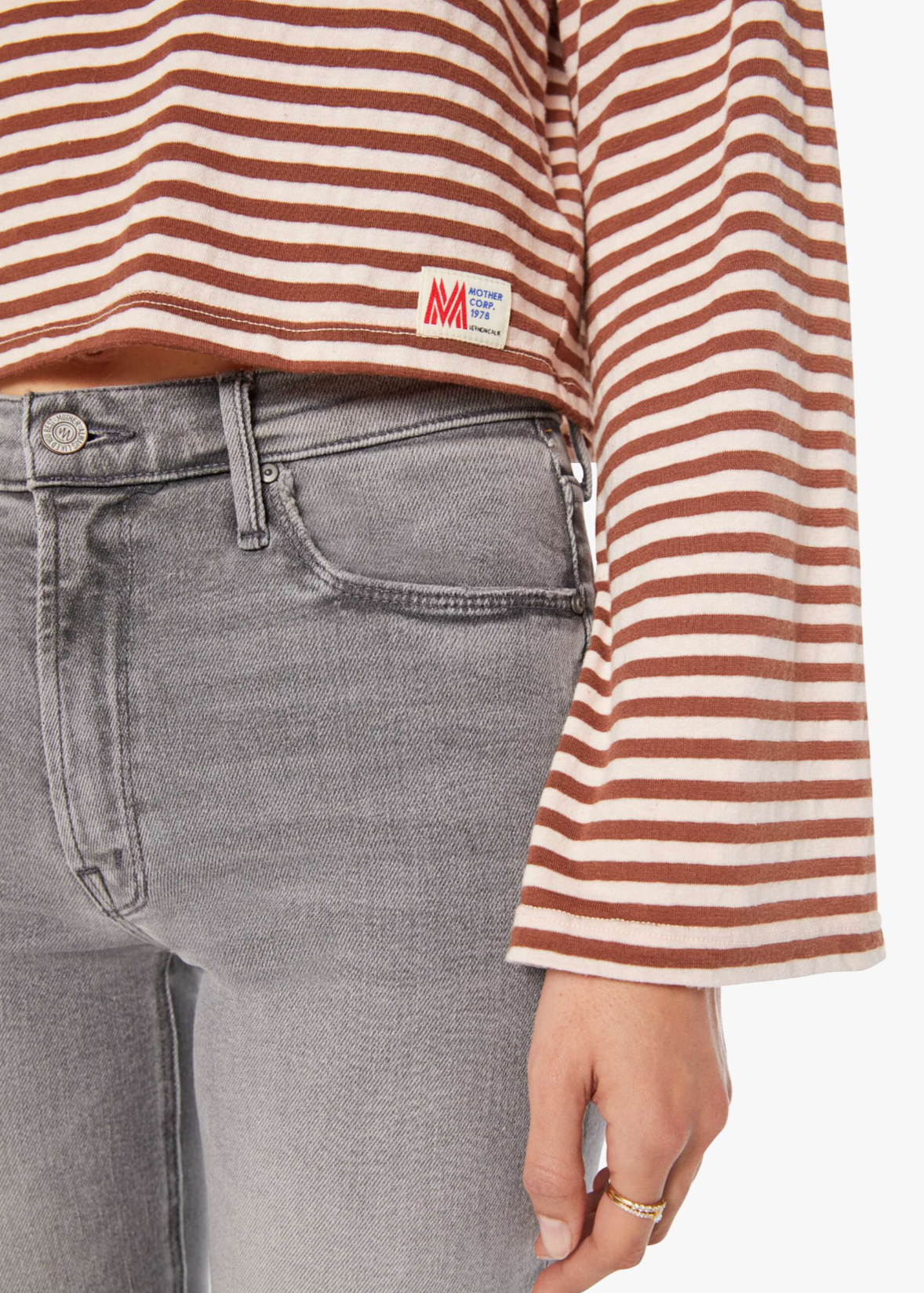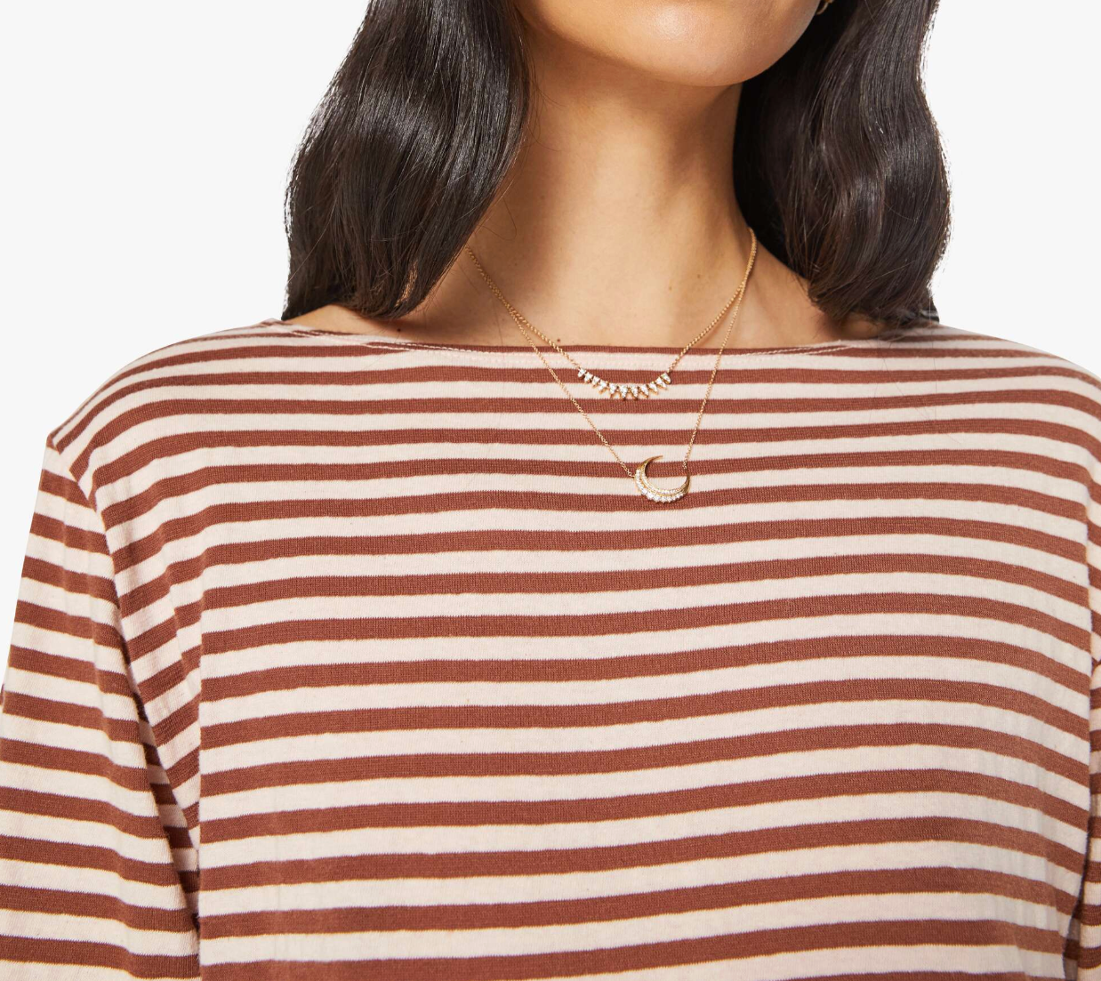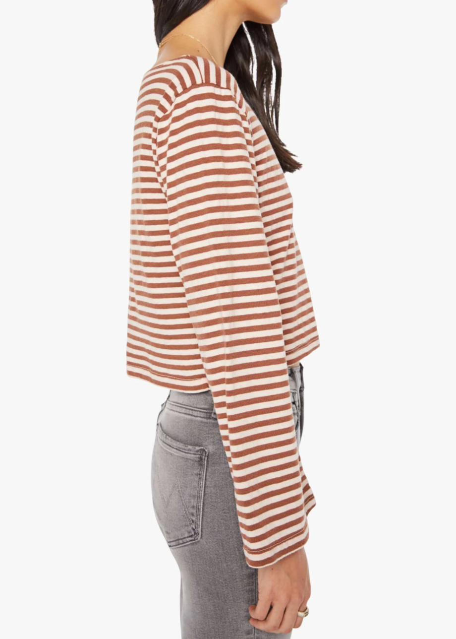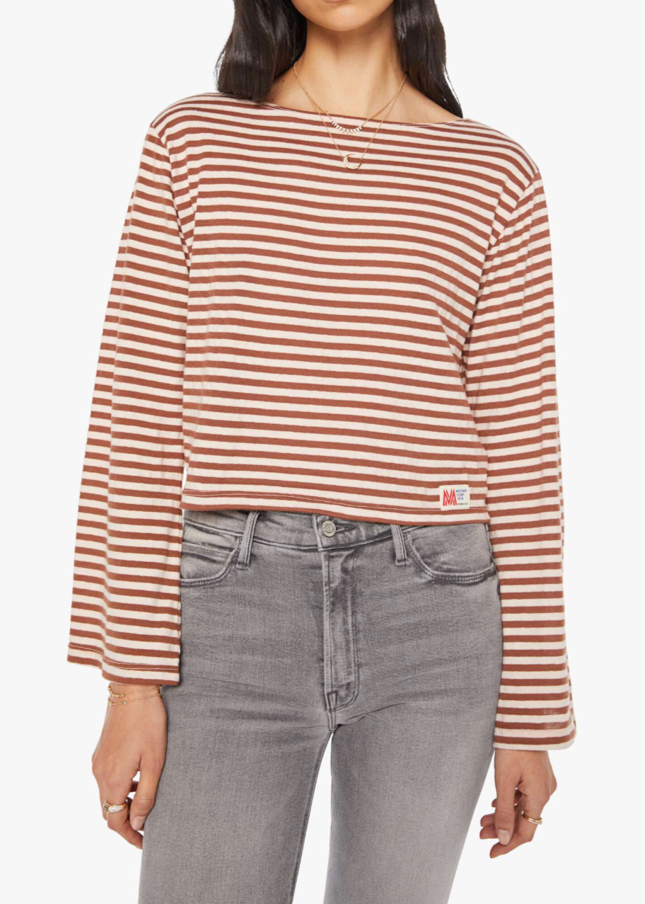A long sleeve tee with a boat neck and boxy fit. Made from stretch cotton, the top is designed in horizontal brown-and-white stripes.