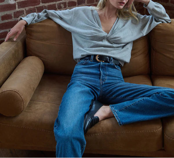 This cashmere cotton blend is a true cozy staple in every collection. Features include a drop shoulder, ribbing at the sleeves and waist for structure, and a gathered, knotted neckline. This one comes in Heather Grey.