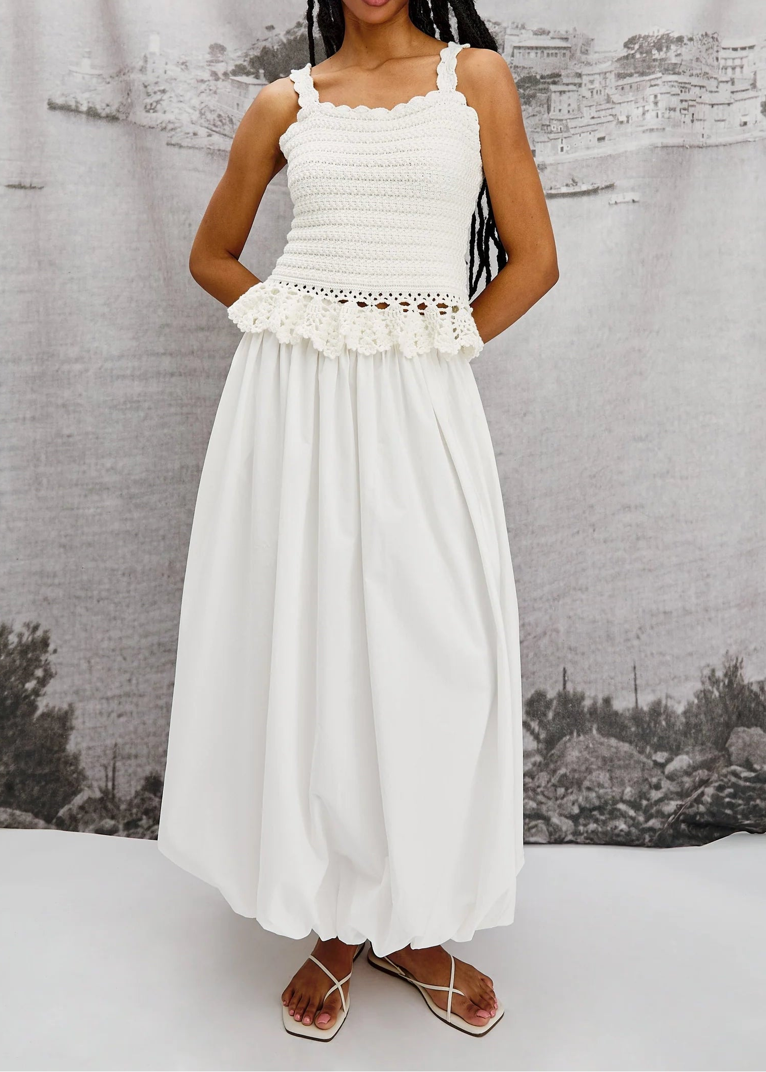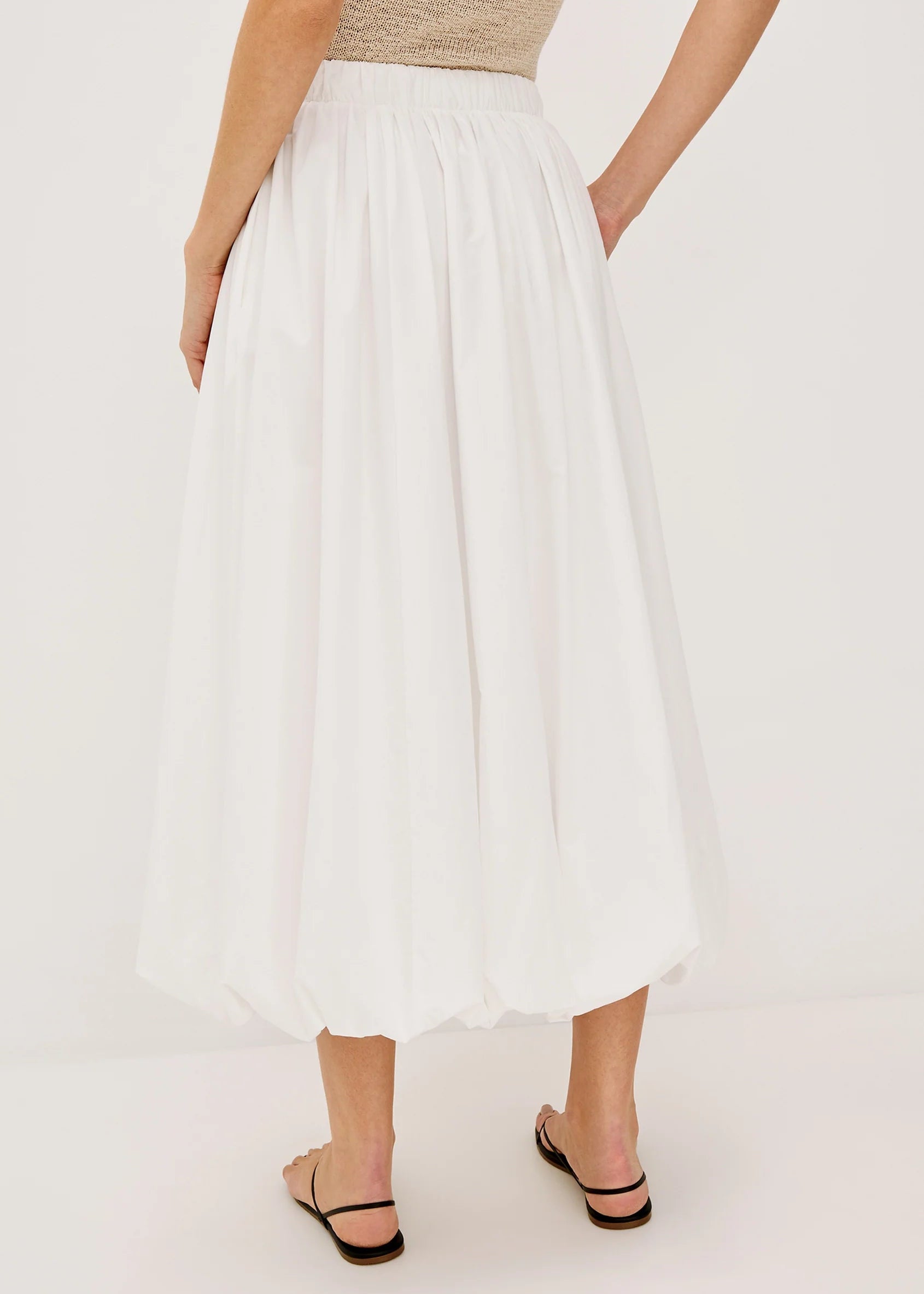 The cotton poplin Cala is a full midi skirt designed with a bubble hem. Finished with an elastic waistband for extra comfort—plus, pockets.