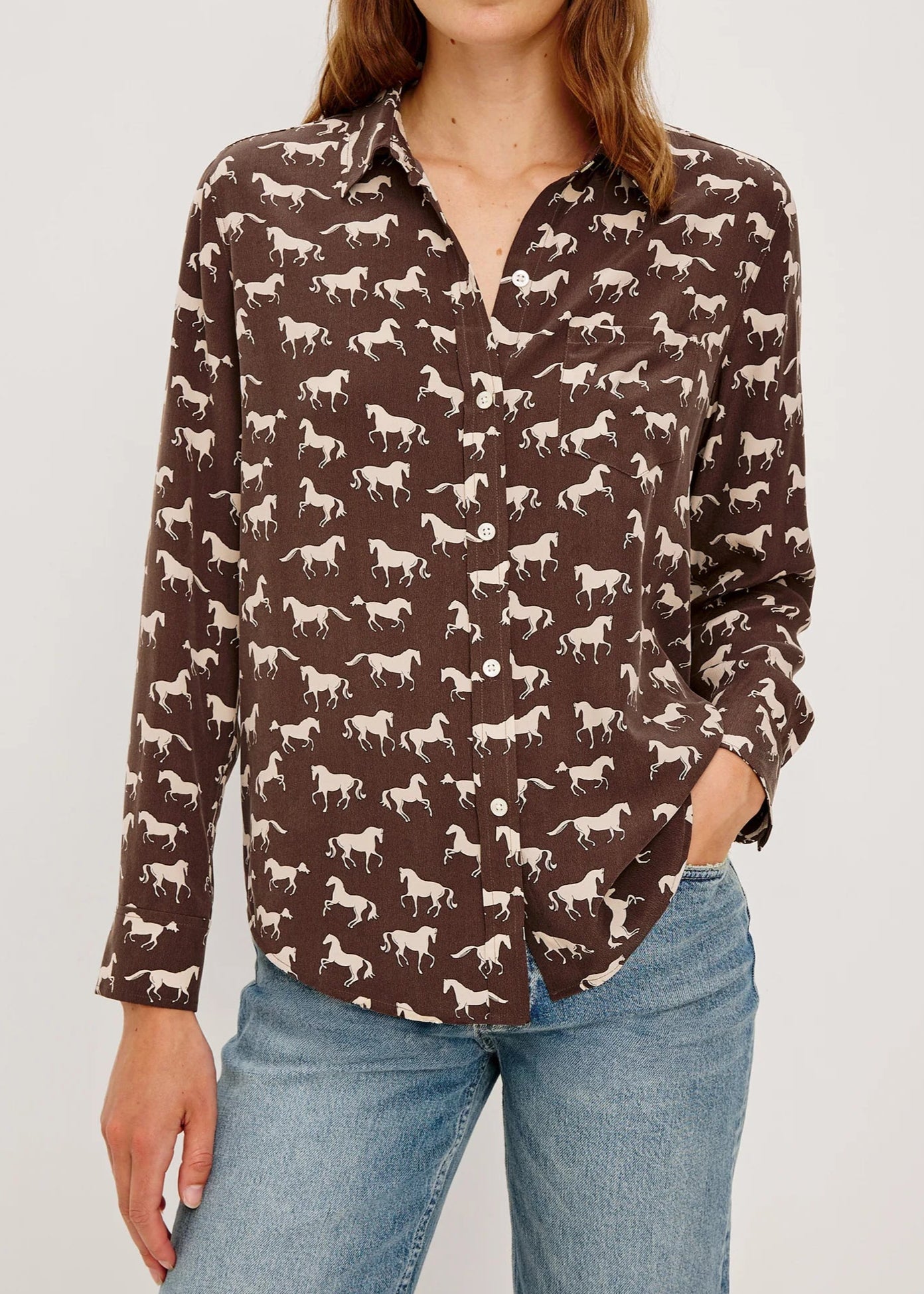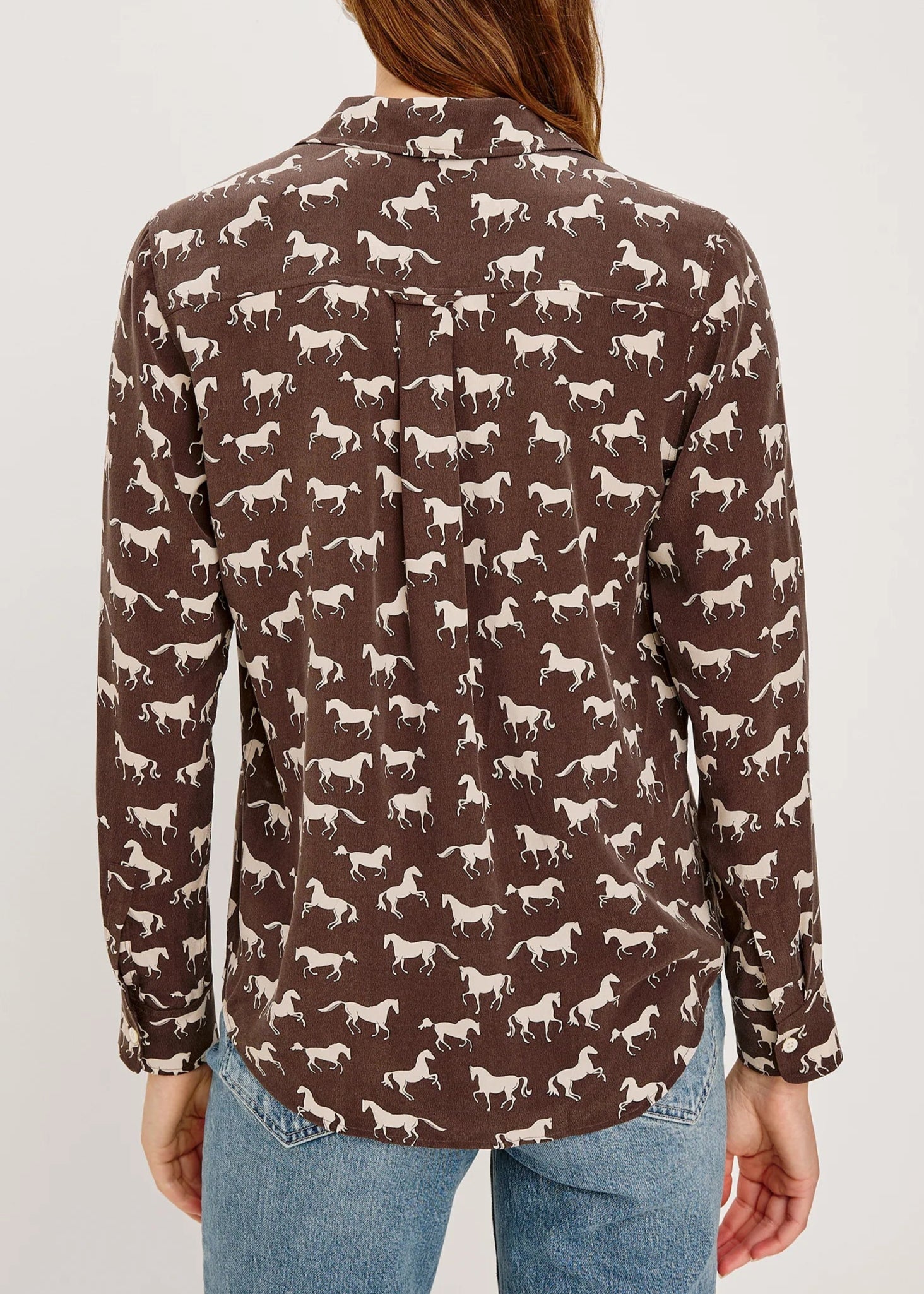 The Kate is an ultra-soft, washed silk button-down. It boasts classic shirting details with a unique print for a polished look.